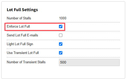 - Schedule: Enforces the times listed below. During these periods, transient parkers cannot pull tickets to enter, effectively placing the location in a Lot Full state.