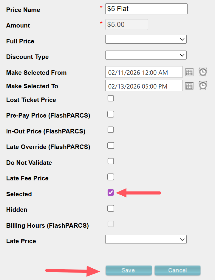 When the "Selected" setting is checked, it will automatically assign that price as the default rate when issuing a ticket for a Flash PARCS or Flash Valet system upon arrival.