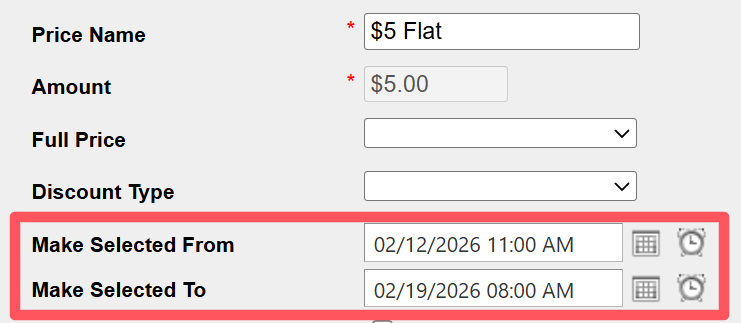 Using the Make Selected From / Make Selected To fields automatically schedules when the price will be active default rate. Typically used for one-time events. The system will automatically set this price as the default rate. The system will automatically switch back to the previously selected rate after the schedule ends.