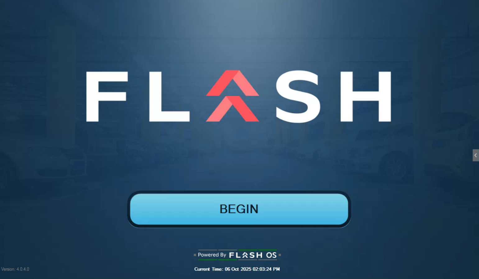 When the screen is inactive, the uploaded logo (default Flash logo), a contact number, Flash system signals, and the default Begin button will appear. For lane kiosks, the screen will change to the next interactive screen once the loop has been triggered.