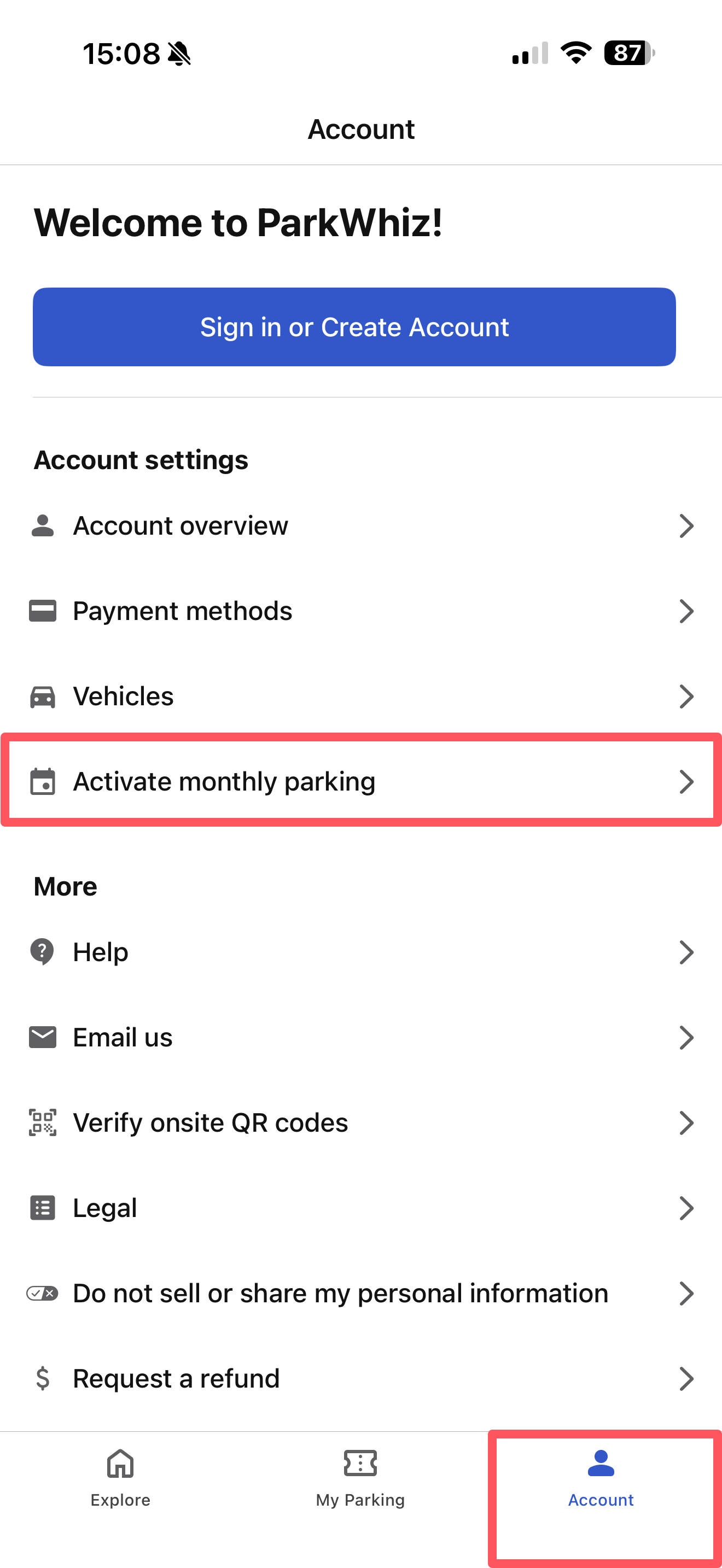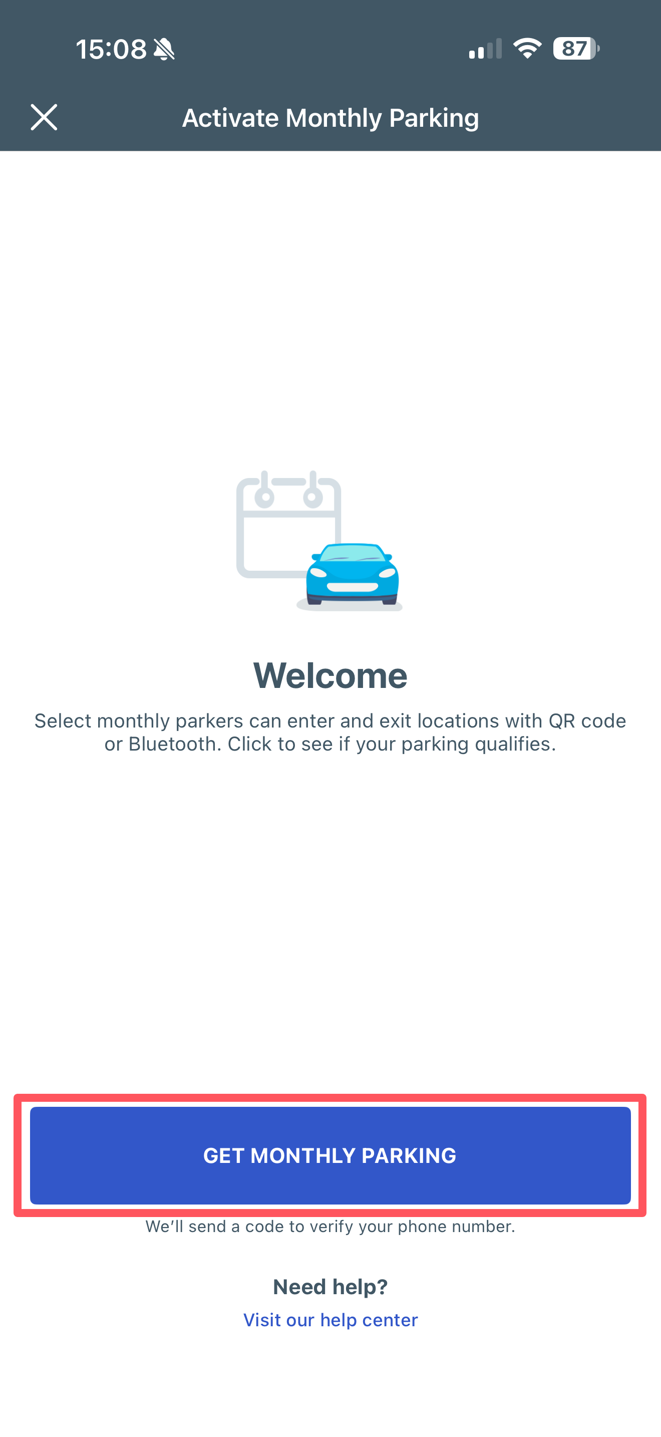 - On the bottom, tap Account > Activate Monthly Parking > Get Monthly Parking.