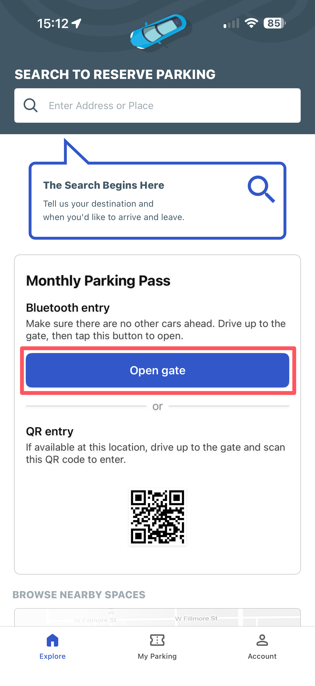 - For the BLE option, while in the Explore tab, tap the Open Gate button.