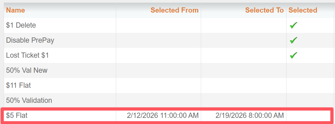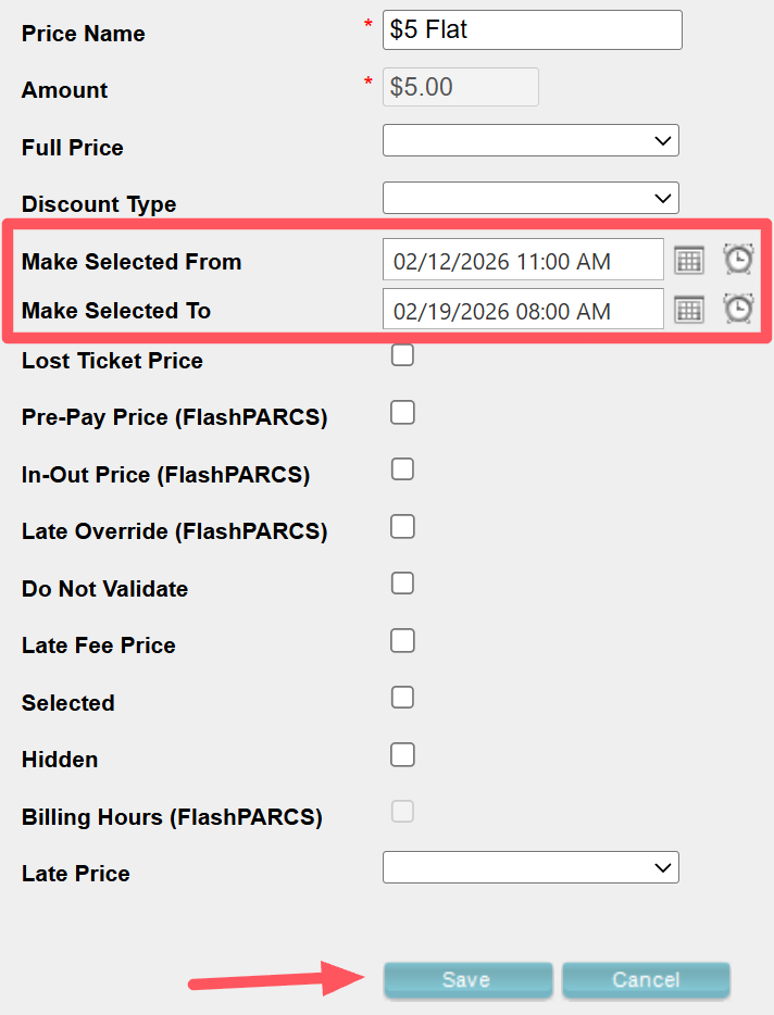 - Validation Prices: Please do not use the “Make Selected From/To” fields with validation prices. These fields are for scheduling standard post-pay or prepay prices only - it will set entry kiosks at the location to that price. Please use this feature with caution.