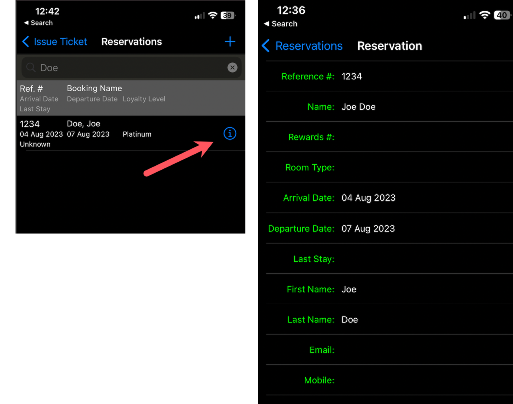 Tapping the blue “i” next the reservation name provides a list of information sent from the hotel system that can be mapped to the Flash Valet.