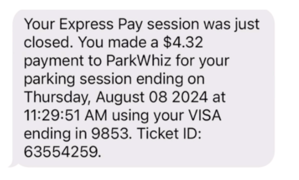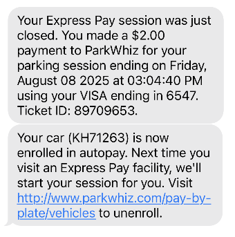 Receipts are available for all Express Pay transactions. In addition to the SMS payment confirmation, receipts are provided via email to the ParkWhiz-associated email address. The payments are also viewable in the ParkWhiz account under My Parking.