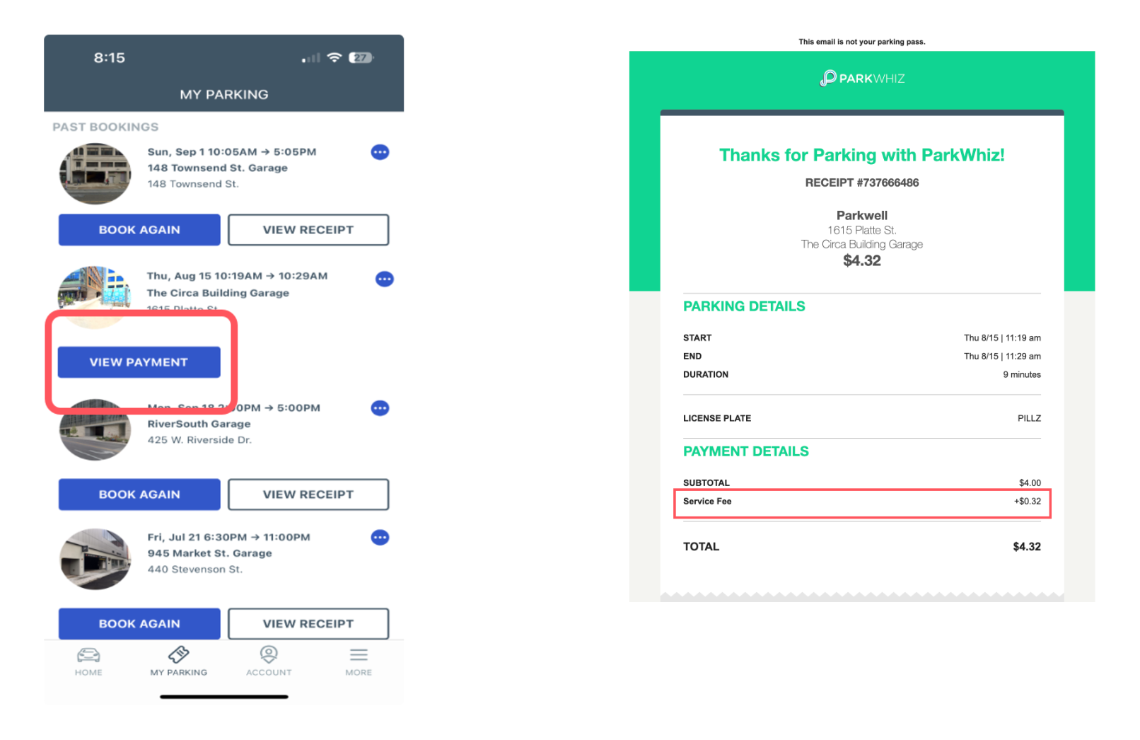 The additional transaction fees are itemized on the provided receipts that are sent via email or are viewable in the ParkWhiz mobile app.