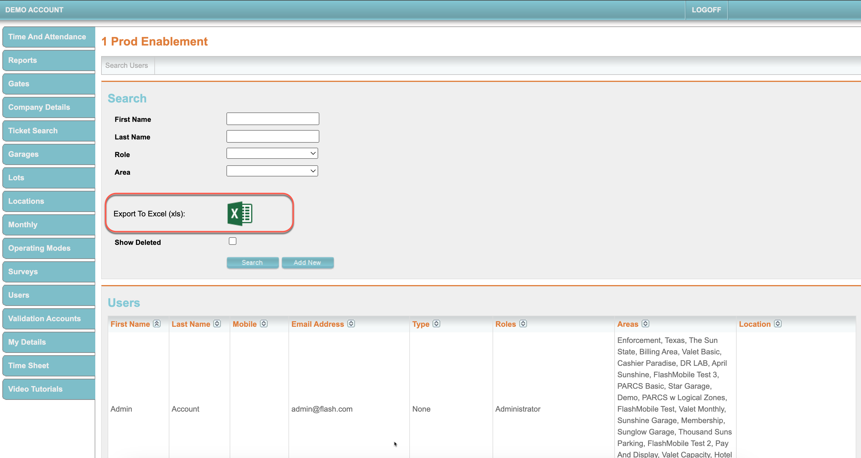 A Flash User Account list can be exported from the User tab in the Flash Admin portal.