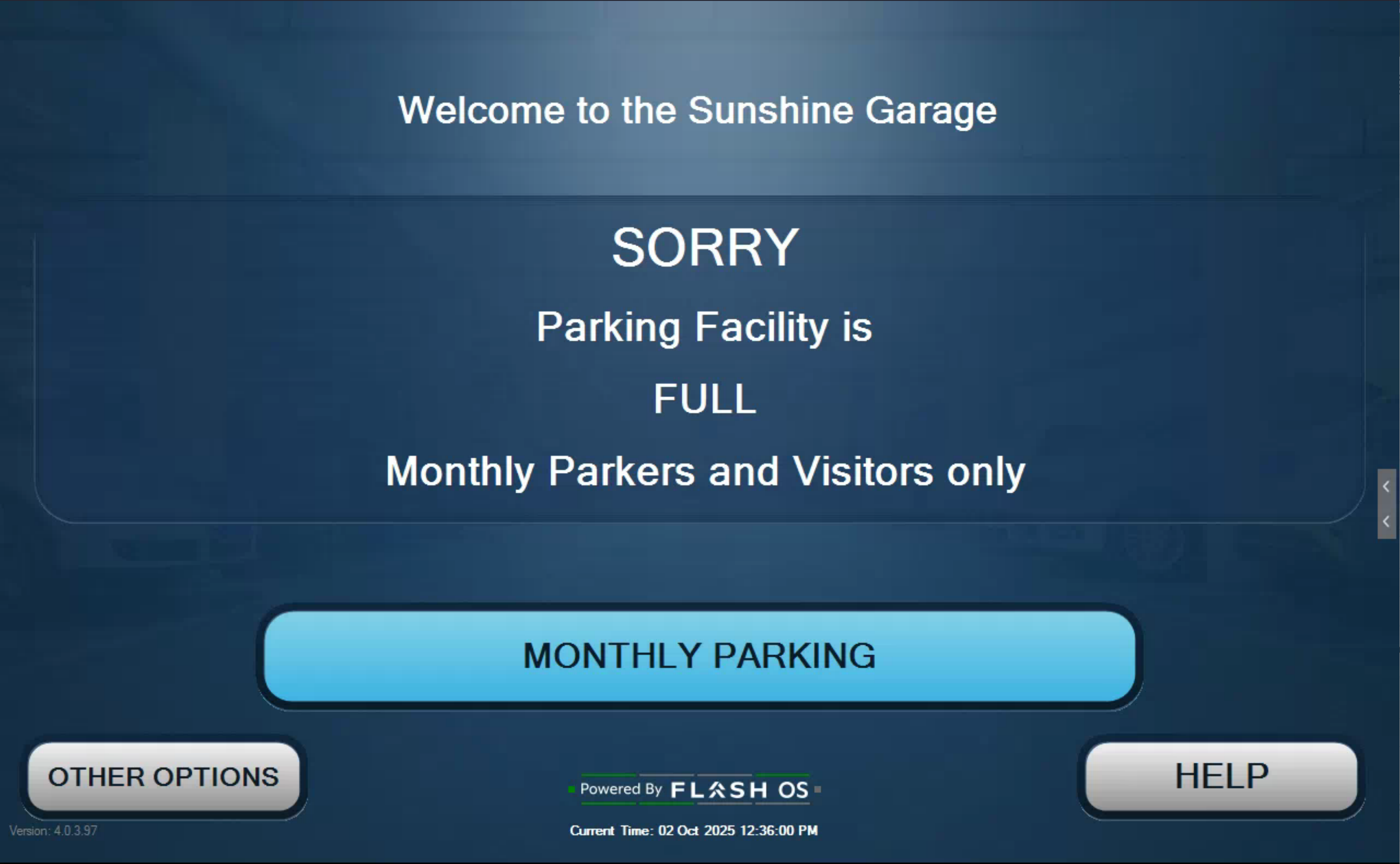 - Full: Closed to transient parkers; open to monthly, membership, and reservation parkers. (Kiosk screen displays Full.)
