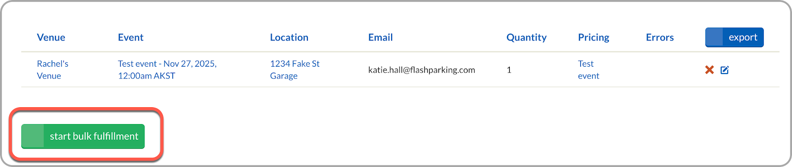 7. Once all rows are added, select the start bulk fulfillment button to send passes to recipients.