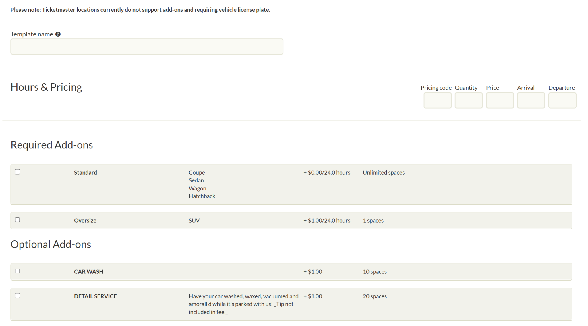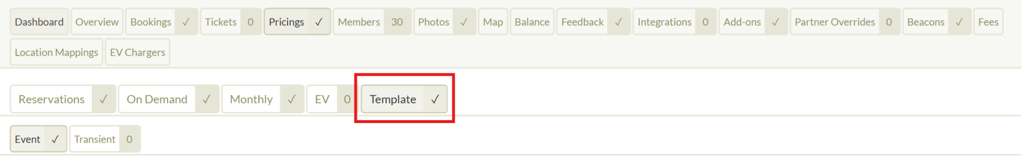 Template pricing automates the process of setting event prices for events integrated into the ParkWhiz system via automated services such as Ticketmaster and StubHub. This functionality ensures that event-specific rates are immediately displayed upon an event's entry into the ParkWhiz system, thereby overriding the typically lower transient rates.