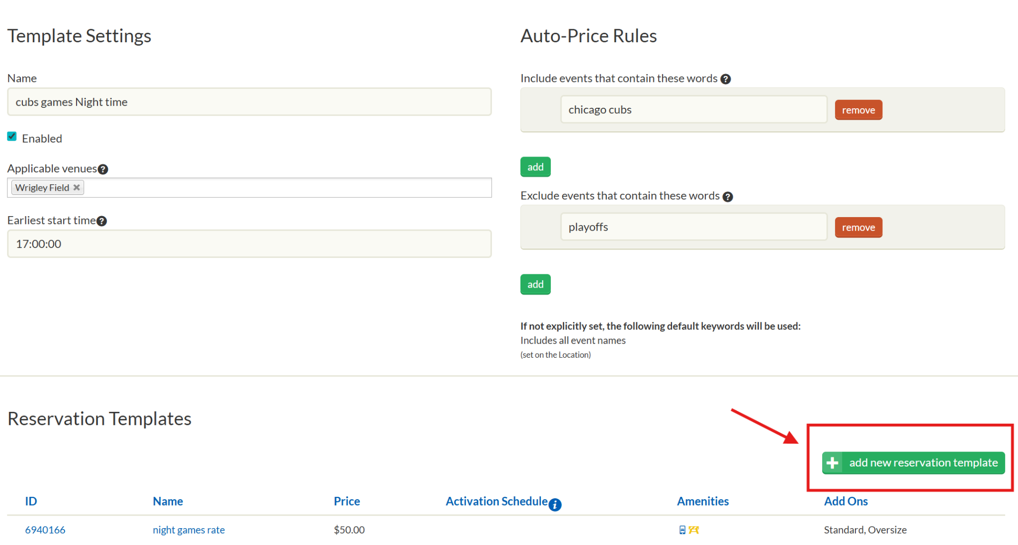 - Example: If a location intends to price Cubs night games at $75 and $85, and all other games at that venue at $50, the Cowboys night games template should be placed at the top.