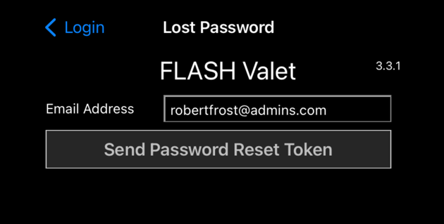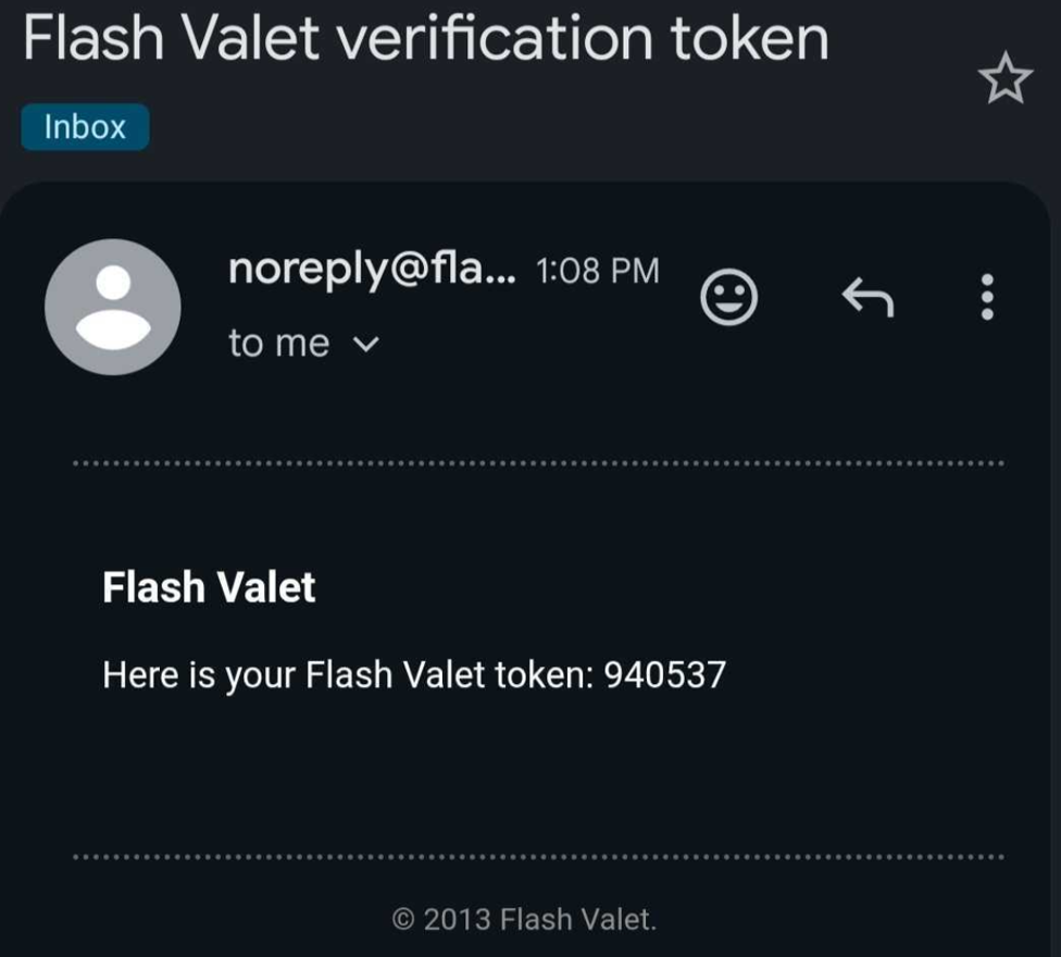 - Check the email for the user account. A message with the subject Flash Valet Verification Token will be received, showing the token number to be used in the next screen that shows after clicking the button in the app.