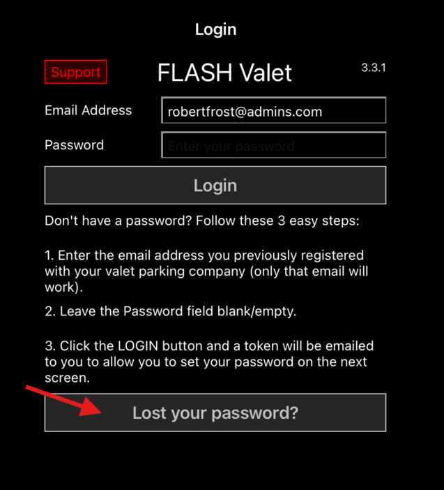 Any user with a valid email address can change their password in the Flash Valet app by clicking the “Lost your Password?” button before logging in. Garage And Dispatcher, Dispatcher, and Garage Only users can change their passwords.
