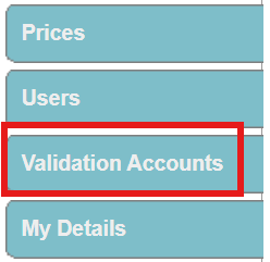 - Click the Validation Accounts blue tab on the left-hand side of the portal screen.
