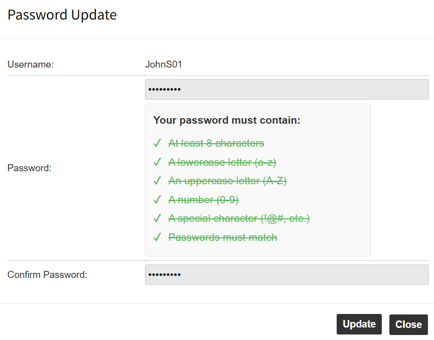 New Passwords must contain the characteristics detailed in the description for the user to be updated: at least 8 characters, a lowercase letter, an uppercase letter, a number, and a special character.