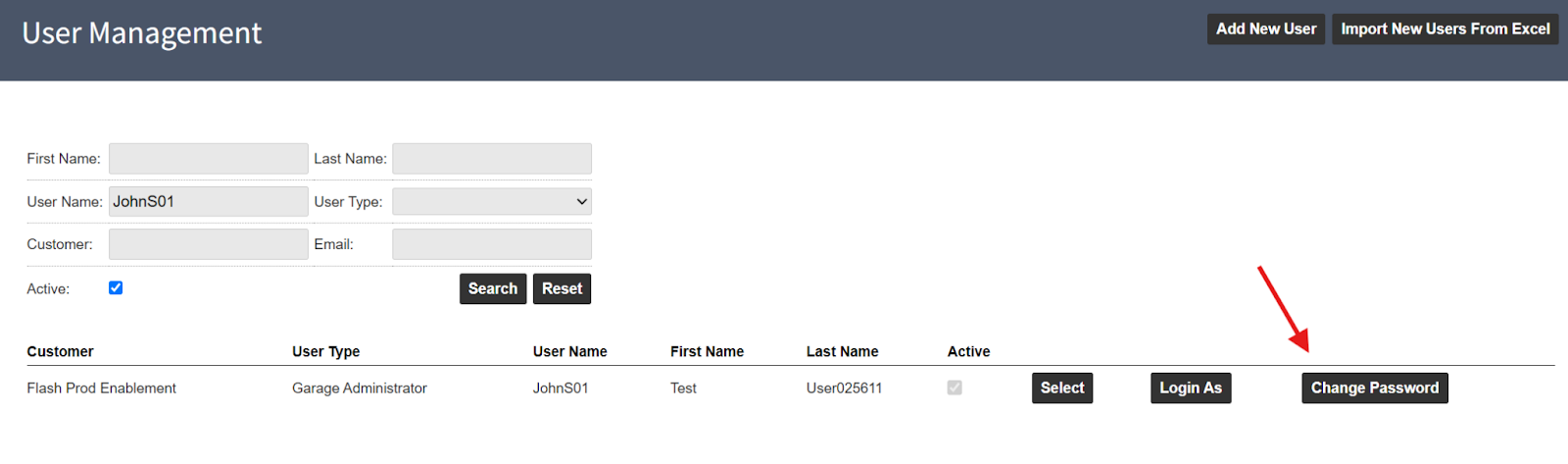 - Search for the user with any of the box parameters given > and click the Change Password button when the desired result appears.