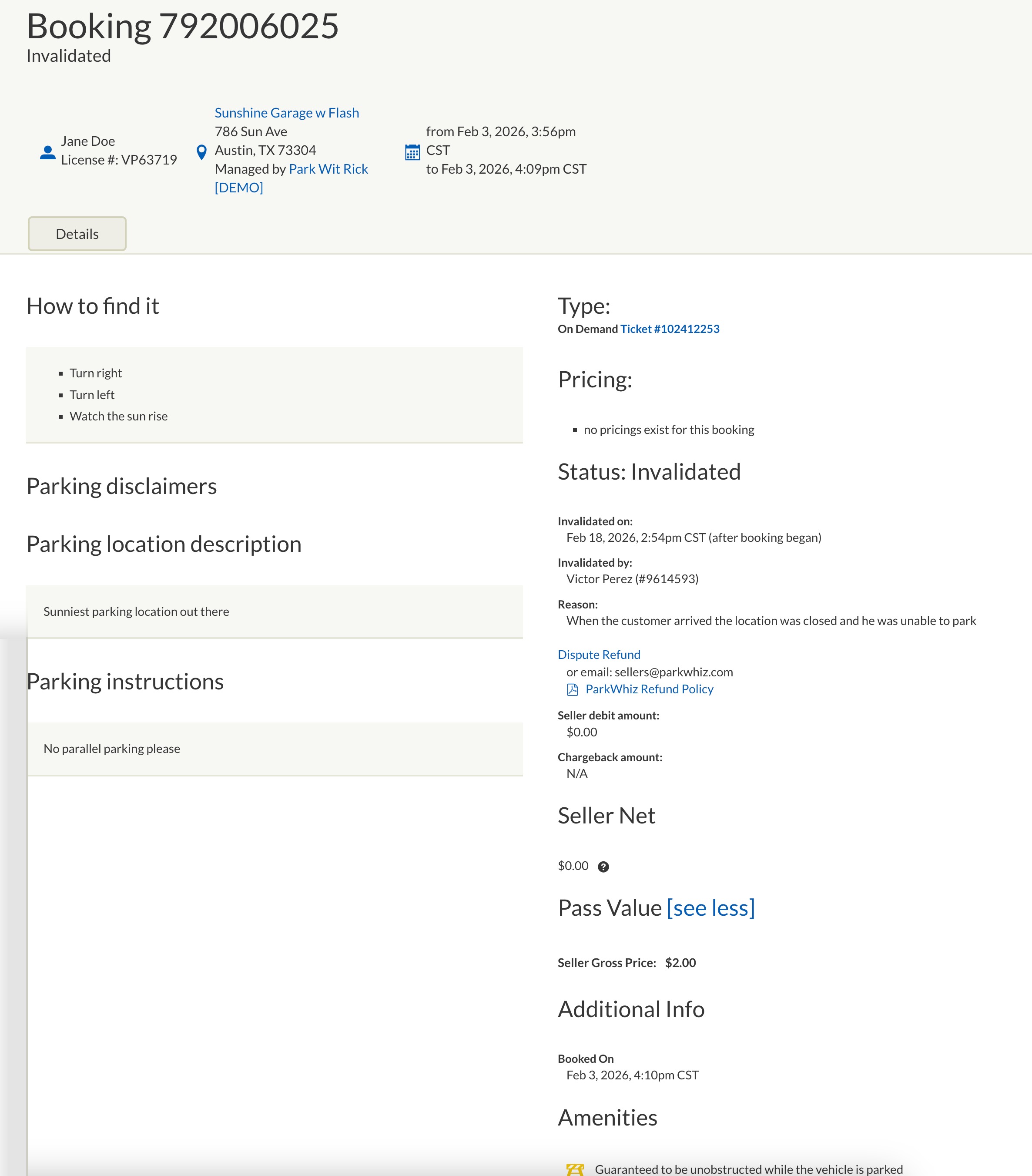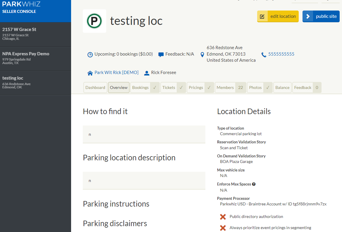 | Overview | Review all information displayed to customers on the public site. (If this information is incorrect, please contact sellers@parkwhiz.com to update.) |
