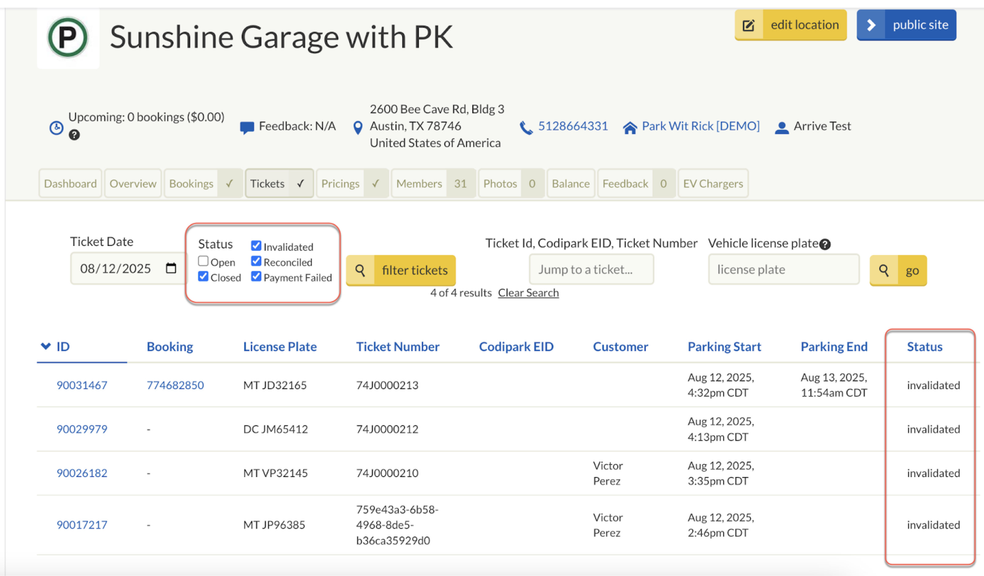 | Tickets | View and filter all On-Demand (Express Pay) tickets for the location by date. |