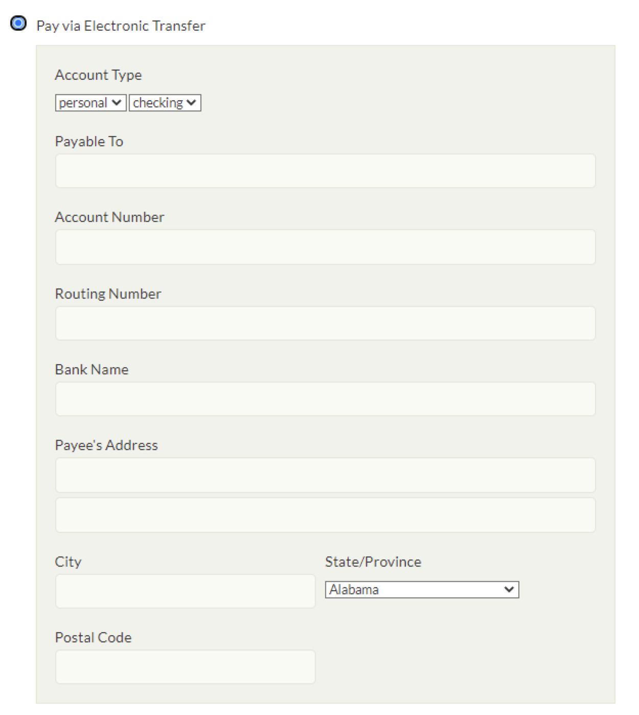 3. Select Pay via Electronic Transfer to display the bank information fields