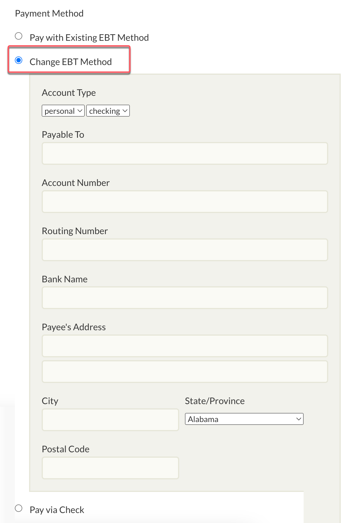 - Select Change EBT Method and complete the form