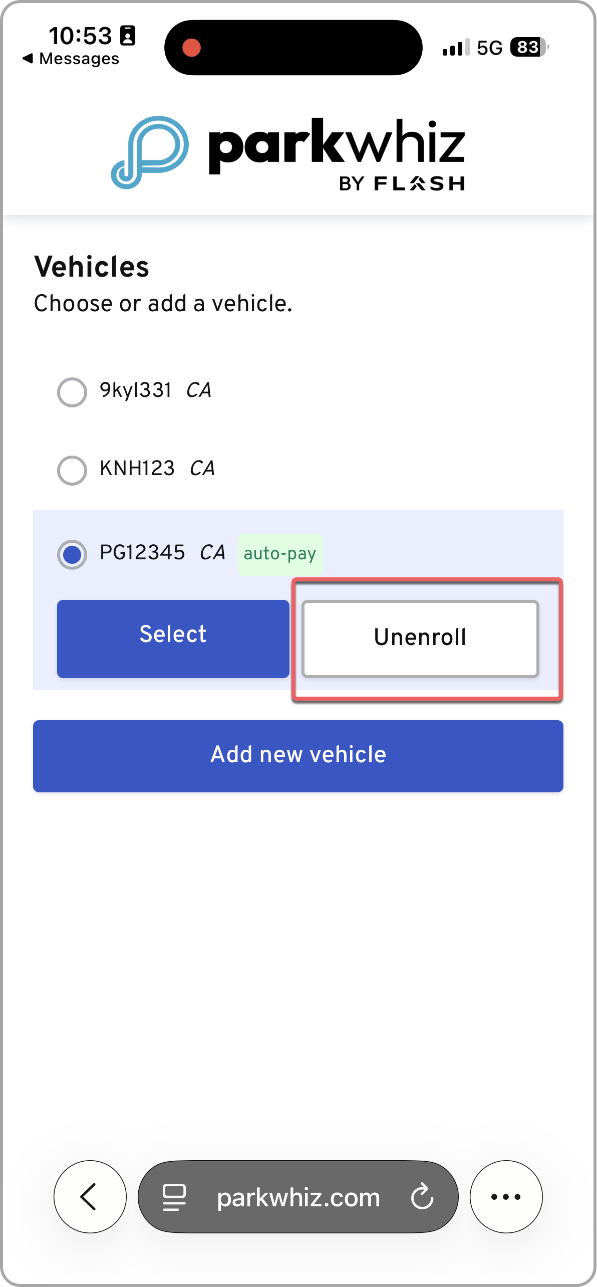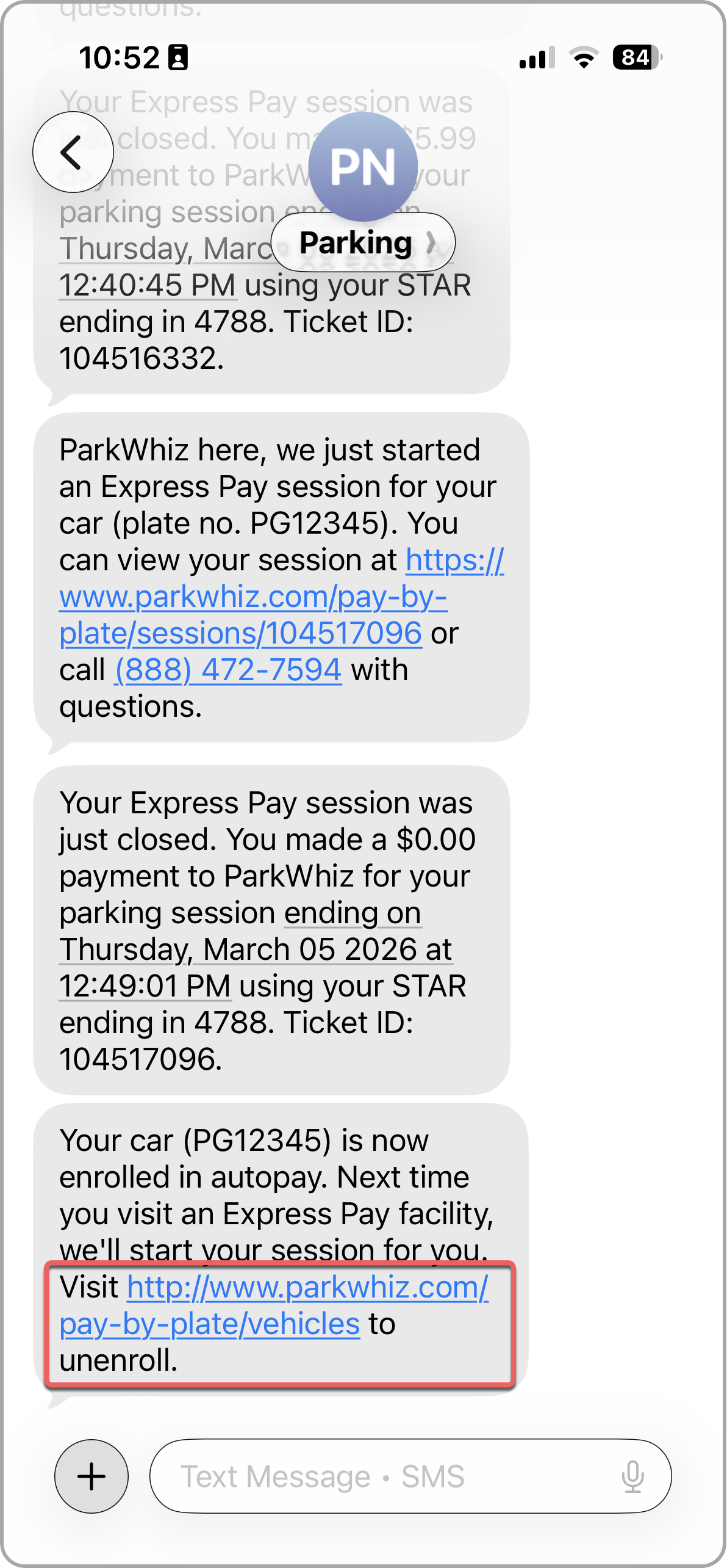 After the Express Pay session closes, drivers select the http://www.parkwhiz.com/pay-by-plate/vehicles link sent via SMS after initial enrollment. Drivers log in using the mobile number to view any vehicles enrolled in Express Pay, then select the option to unenroll the vehicle.