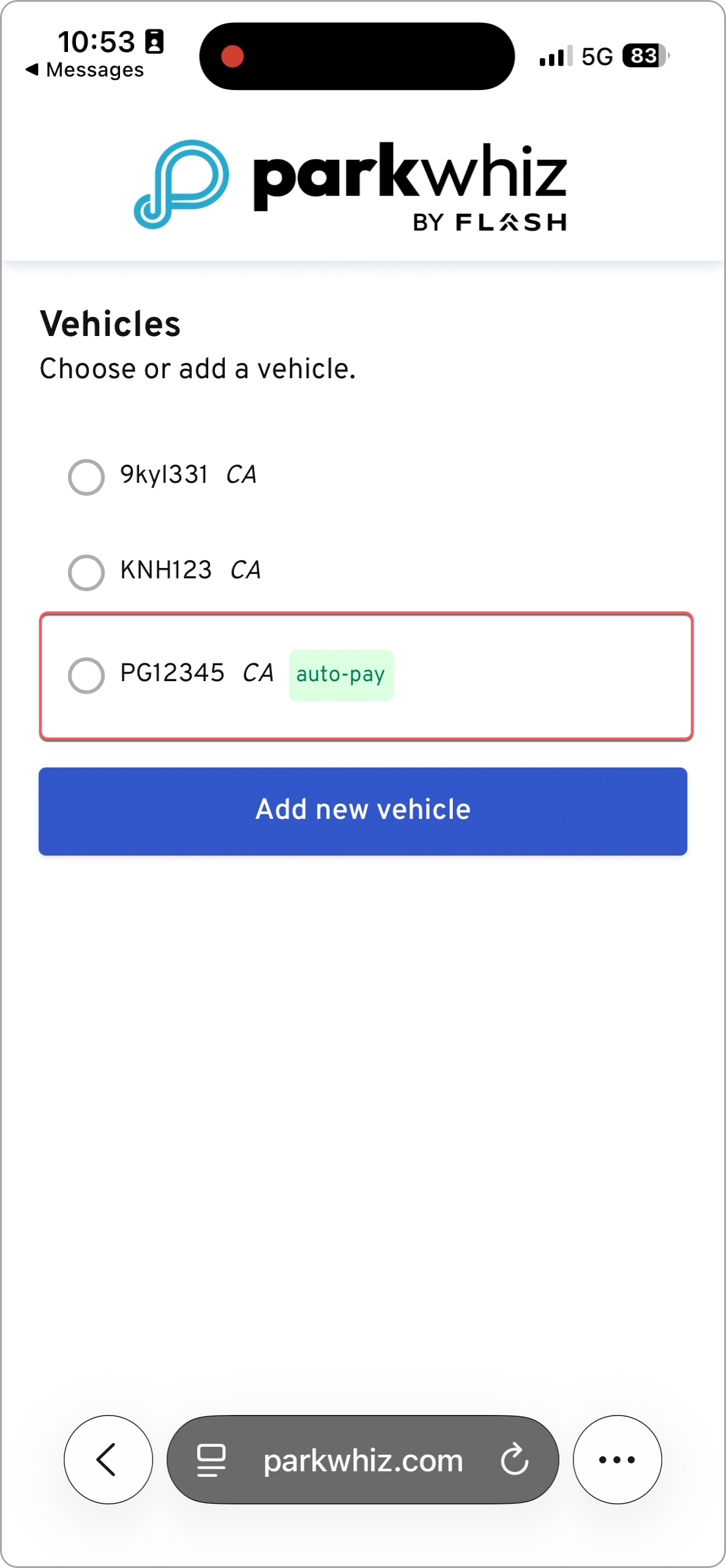 Alternatively, the vehicle can be deleted from the ParkWhiz account which will unenroll from Express Pay. This requires downloading app or logging in at parkwhiz.com.| 1. After enrolling a vehicle in Express Pay, the driver receives a confirmation text with a link to unenroll the license plate if needed. Tap the link to view vehicles. | ![]() |